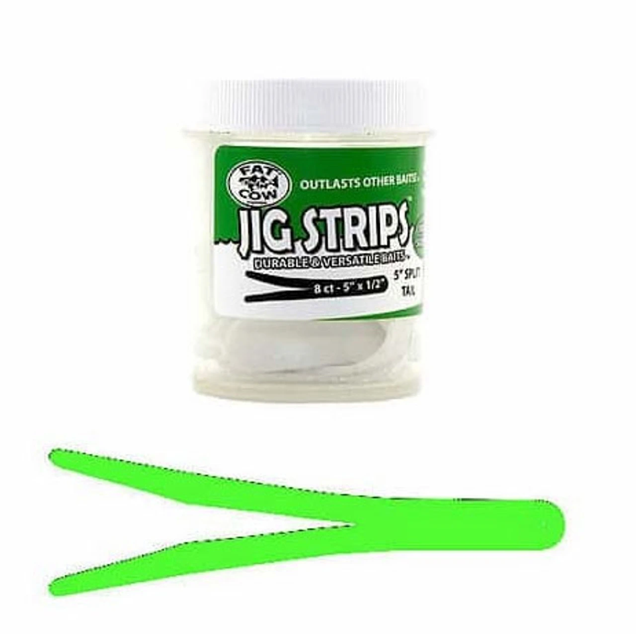 The Fat Cow Jig Strips Split Tails feature split tails and bright coloring for strike simulating action and are scented with squid oil. The flat design helps to keep your lure suspended in the strike zone longer. The design of these strips helps to decrease the sink rate of your lure as well. To use, simply attach your lure of choice and fish as you normally would. These scented strips are perfect for surfcasting bucktails, trolling tubes, jigging, and umbrella rigs. The container fits in your pork rind holder.