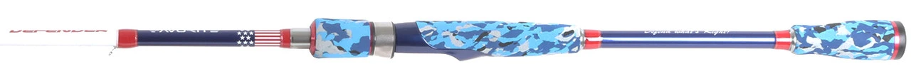 Tough enough to be tossed in the truck and boat, but sensitive enough to feel even the softest of bites, the Powered By Favorite Defender Spinning Rods were designed for the everyday American fisherman. The Defender features a patriotic color scheme that you can’t miss, but it’s more than just a show piece. It is built around an IM24T carbon blank constructed with Favorite’s Multi Layer Structure technology. These blanks are produced from a layering process where carbon of different modulus and different fiber directions are strategically layered on top of one another to achieve the desired rod action, increase durability, and lower weight. Favorite has also added their FX Grid technology to the mix where an x-like carbon tape is wrapped throughout the butt and middle sections of the blank for increased rod power. These rods are fitted with Fuji SiC guides and blue camoflauge EVA split grips.