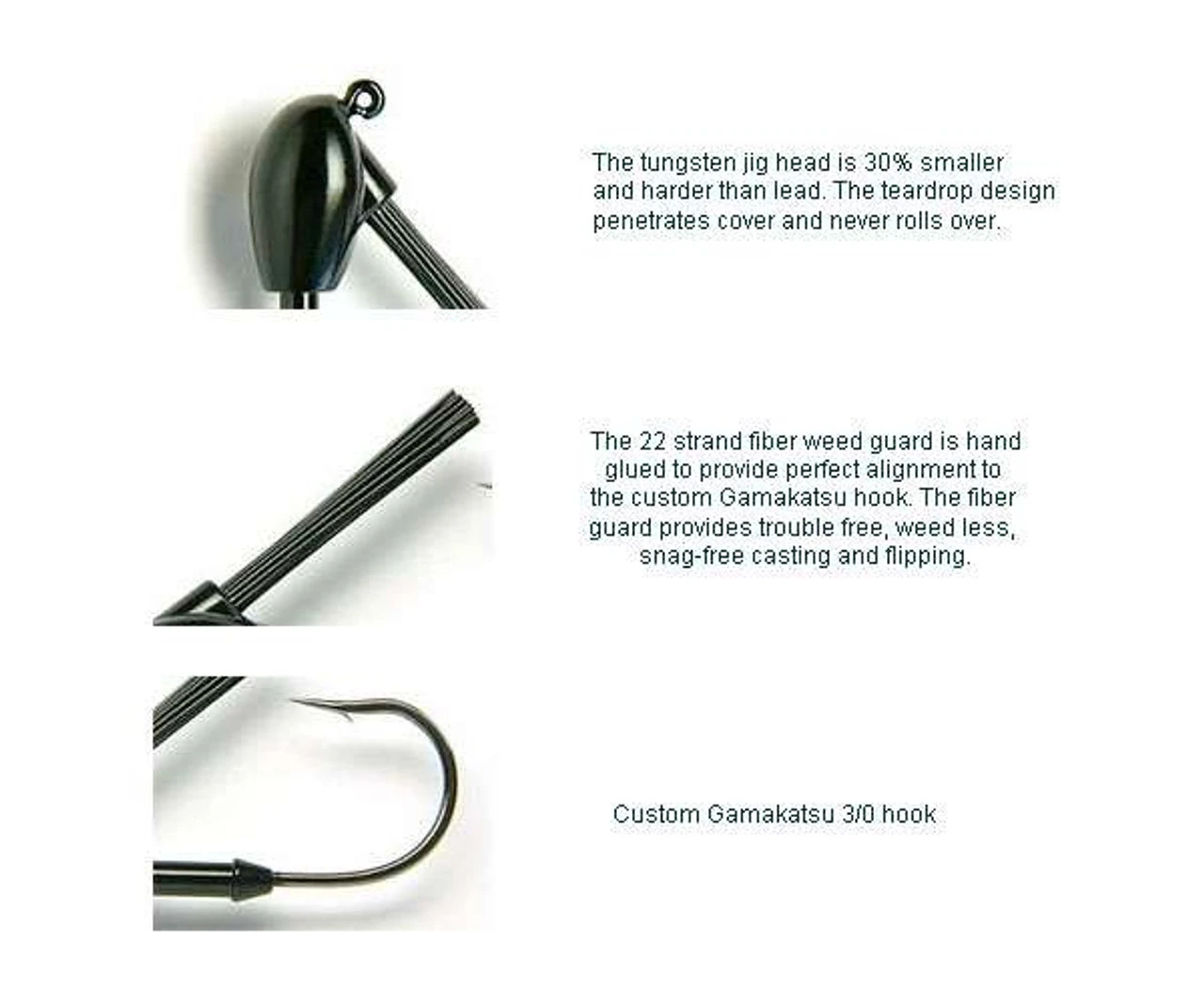The Keitech Model I Tungsten casting jig has many features not found in your ordinary bass jig. The tungsten tear drop, powder coated head is perfectly balanced. It penetrates cover and does not roll over. The hand tied 150 strand skirt is produced from Keitech’s exclusive SR-40 silicone. This super soft, fine cut material provides remarkable life-like action. The weed guard is hand glued to ensure perfect alignment to the custom Gamakatsu 3/0 hook. This compact size tournament winning jig excels under all conditions and is the only jig to throw when the money’s on the line!