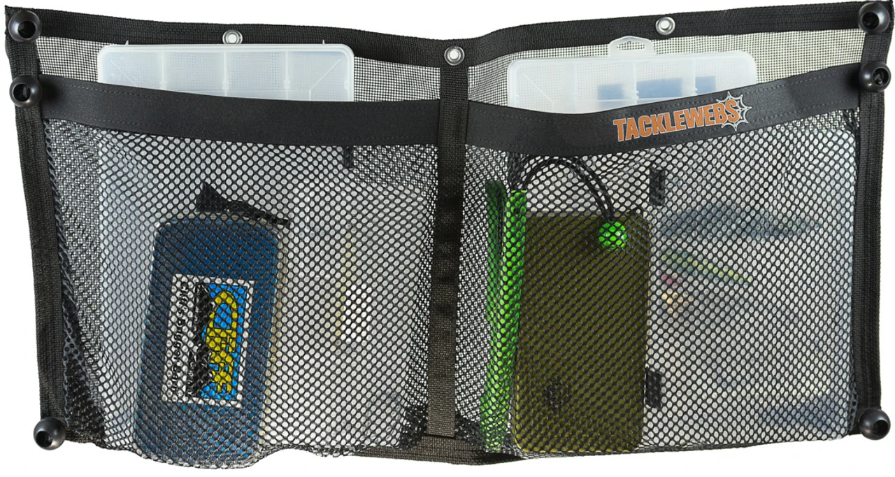 The TackleWebs Bungee/Grommet 32in x 15in Gear Storage Double Pocket is part of a multi use suspending storage system perfect for use on all types of watercraft. Tacklewebs storage pockets using the bungee/grommet system utilize stainless steel grommets and six bungee cord straps to allow the pockets to be installed in a wide variety of locations. The bungee system is perfect for installing TackleWebs between rails on your boat, on the backs of kayak seats, or in other locations where permanent mounting is not an option. The pockets utilize a zipper-less hook and loop closure to safely secure contents while avoiding corrosion and zipper failures.